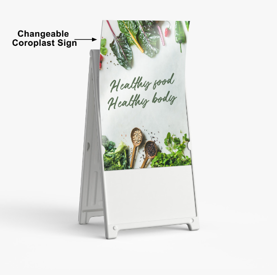 Our Deluxe A-Frame Sign is the ultimate sidewalk advertising solution for those that need quick change graphics. The heavy-duty plastic sandwich board has two recessed 24x36 inch recessed graphic areas on the front and back. 24" x 36" signs slide easily into place for display, swap out rigid inserts as often as you need. Our graphics are full-color UV direct printed coroplast for a long-lasting durable matte print.